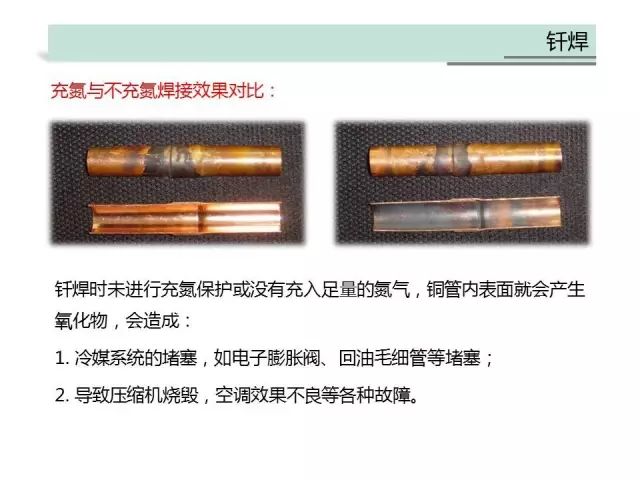 ①、釬焊時未進行充氮保護或沒有充入足量的氮氣,銅管內(nèi)表面就會產(chǎn)生氧化物,造成冷媒系統(tǒng)的堵塞,導(dǎo)致壓縮機燒毀,空調(diào)效果不良等各種故障。